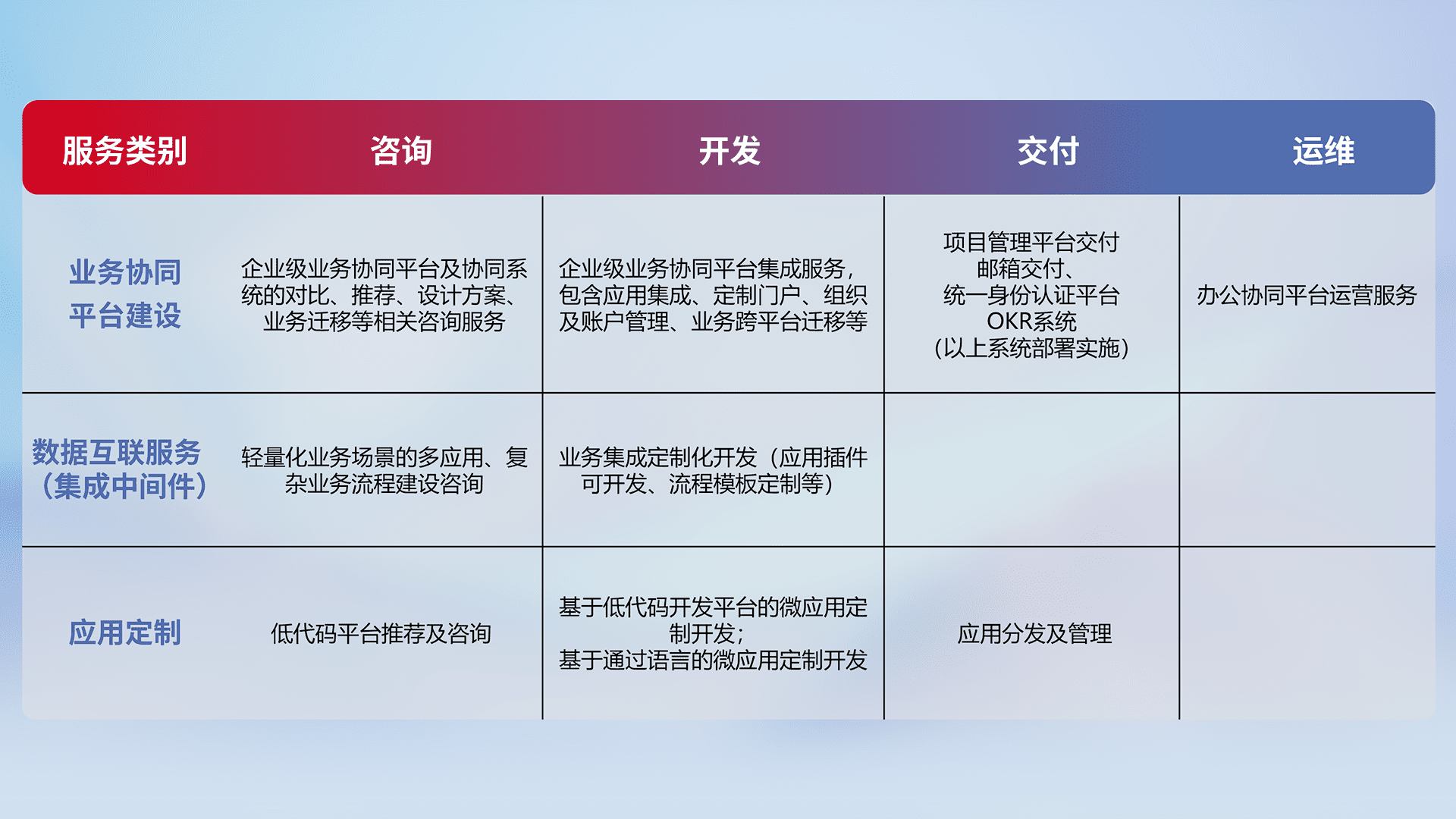 针对钉钉、、企微、、、IDaas等平台级产品提供产品的规划、、、、方案、、、、交付、、、、定制化开发等服务,,,,实现如统一协同办公、、、智能客户服务、、、、混合会议管理、、、、智能数据查询、、等业务场景,,,实现数字化转型。。。
