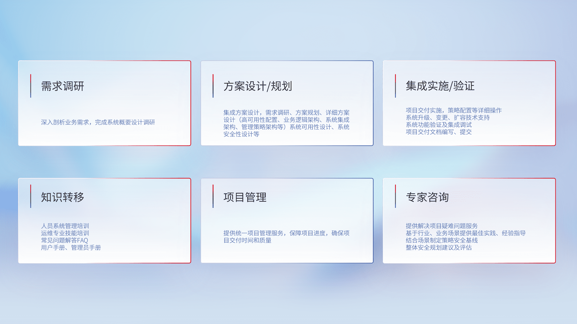针对客户行业特性,,,将宏观的安全战略和需求,,,通过专业的交付服务,,,实现项目落地,,,,为客户提供标准规范的集成交付服务。。
